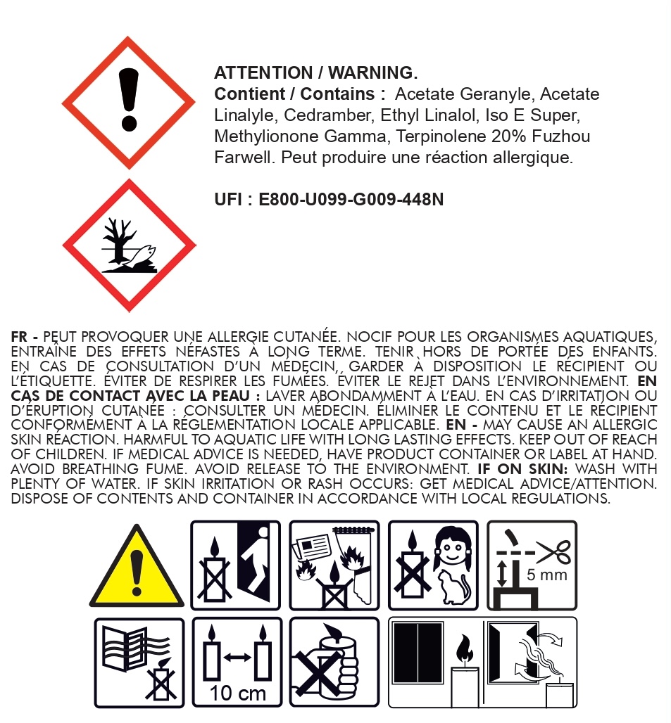 CONTIENT ACETATE GERANYLE; ACETATE LINALYLE; CEDRAMBER; ETHYL LINALOL; ISO E SUPER; METHYLIONONE GAMMA; TERPINOLENE 20 % FUZHOU FARWELL. Peut produire une réaction allergique.