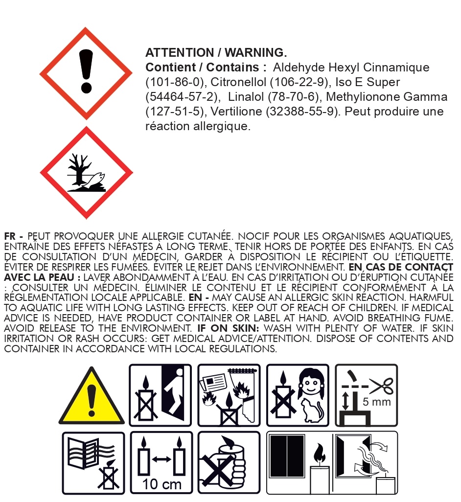 CONTIENT ALDEHYDE HEXYL CINNAMIQUE(101-86-0), CITRONELLOL(106-22-9), ISO E SUPER(54464-57-2), LINALOL(78-70-6), METHYLIONONE GAMMA(127-51-5), VERTILIONE(32388-55-9). Peut produire une réaction allergique.